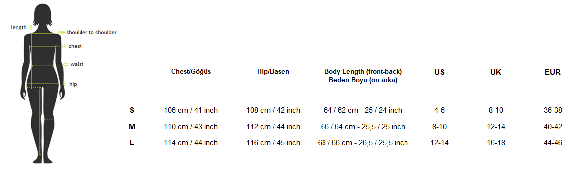 - Model ölçüleri: Kalça: 88 cm, Bel: 60 cm, Göğüs: 80 cm, Uzunluk: 1.75 cm (Beden: 36-38)