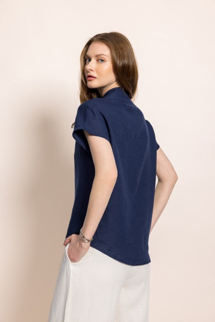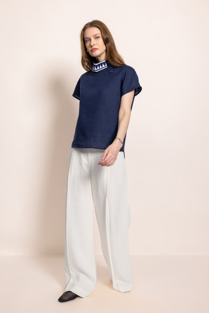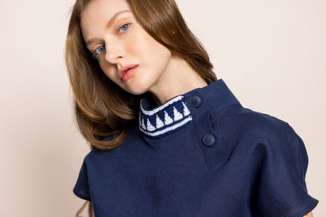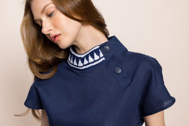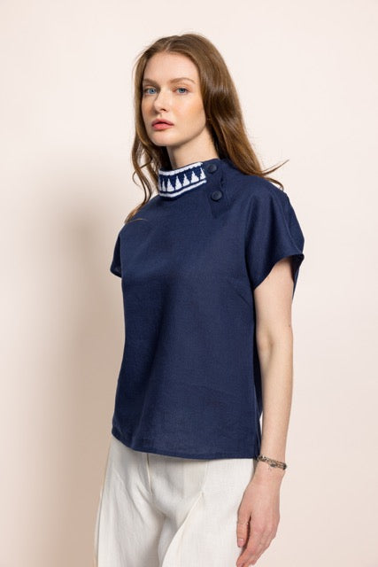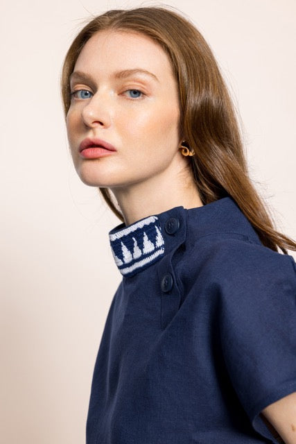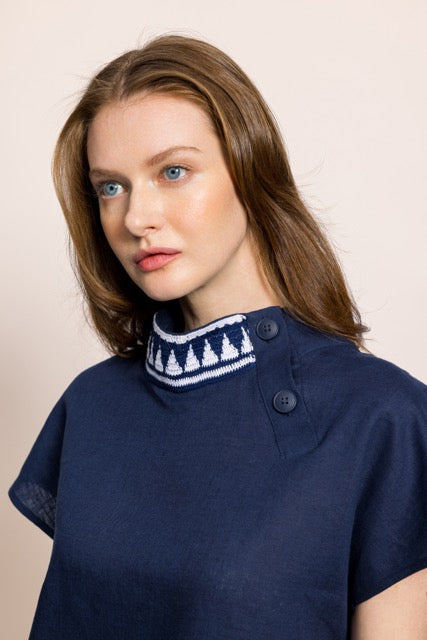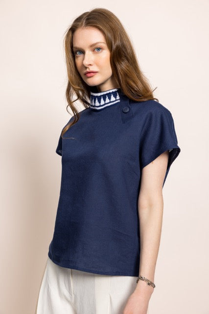 İbibik Beyaz ve Lacivert Yakası İşlemeli Lacivert Keten Bluz