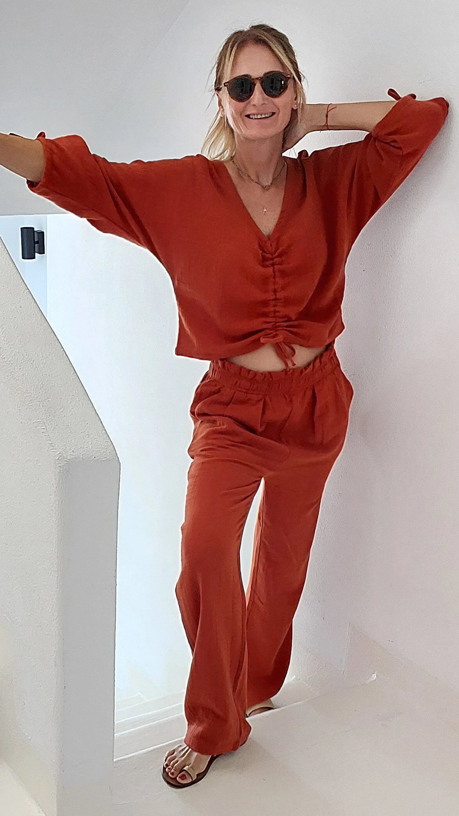 Zarafeti ve doğallığı bir araya getiren bu özel tasarım bluz, %100 organik sertifikalı pamuk müslinden üretilmiştir. Hafif ve nefes alabilen dokusu sayesinde her mevsim rahatlıkla kullanabileceğiniz zamansız bir parçadır.