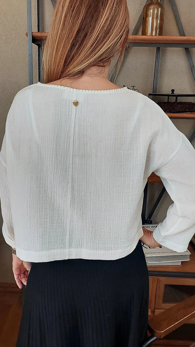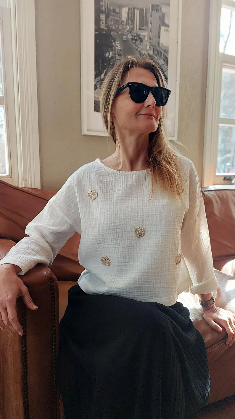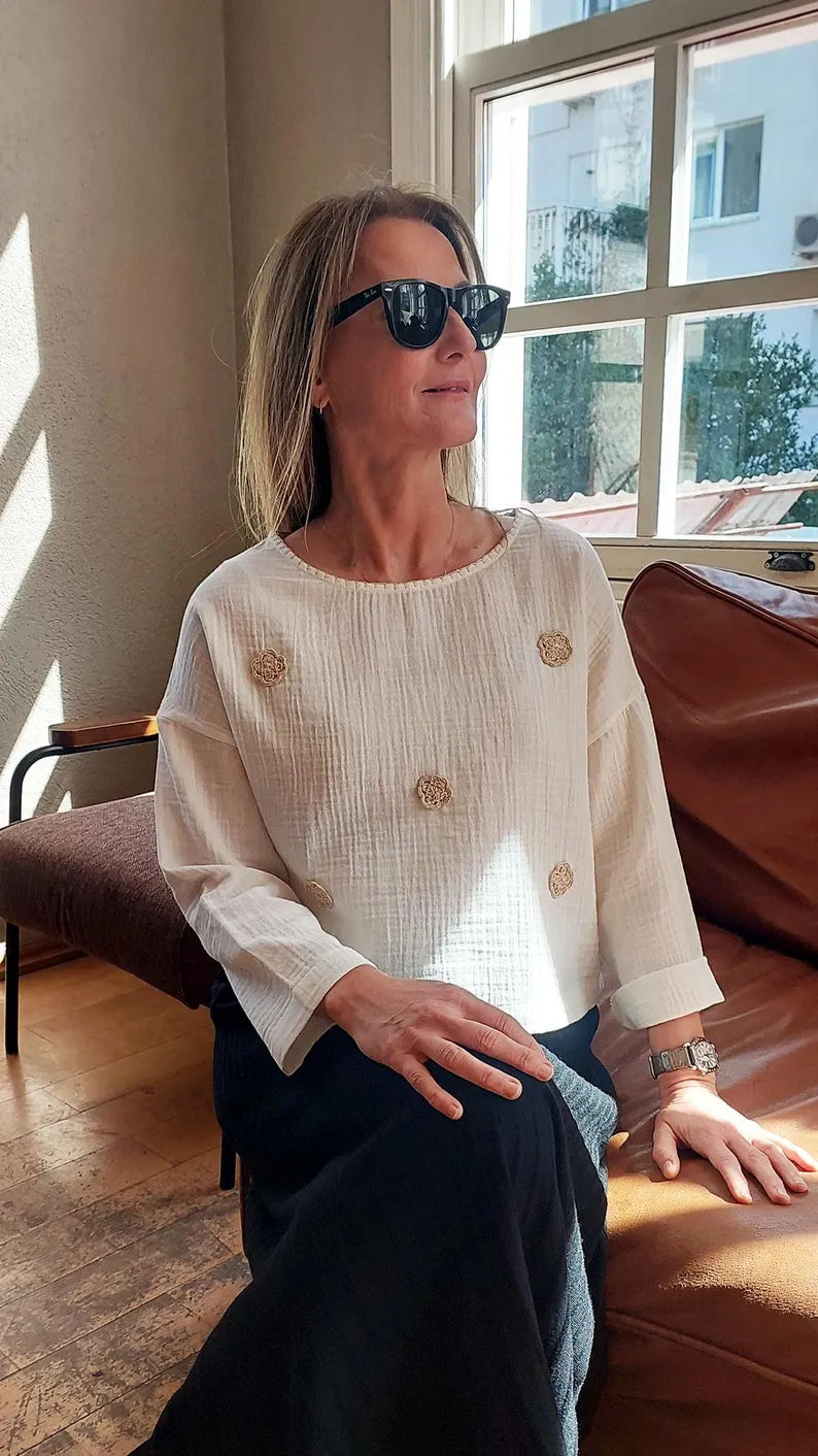 Çiçek Nakışlı Beyaz Müslin Bluz