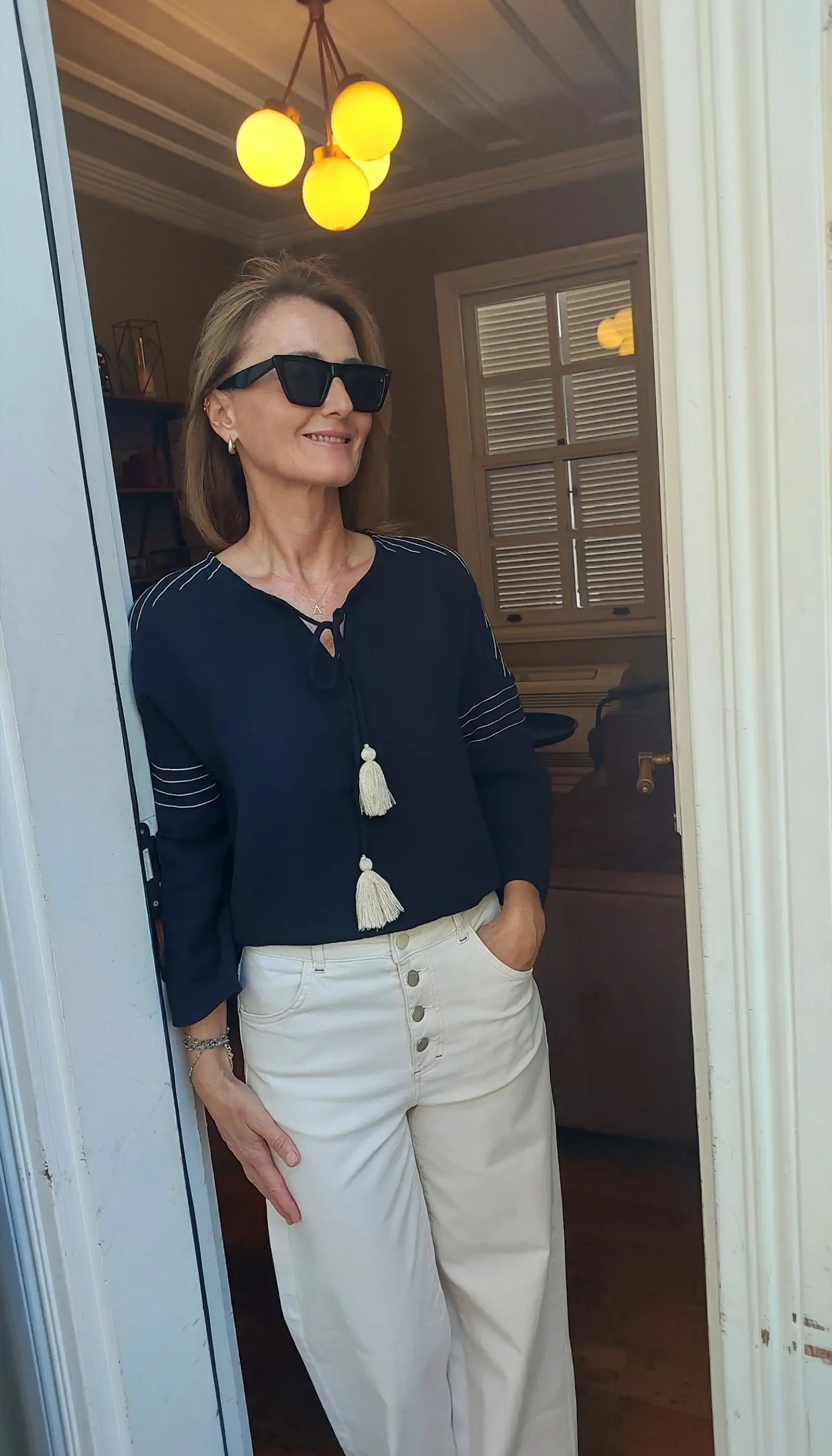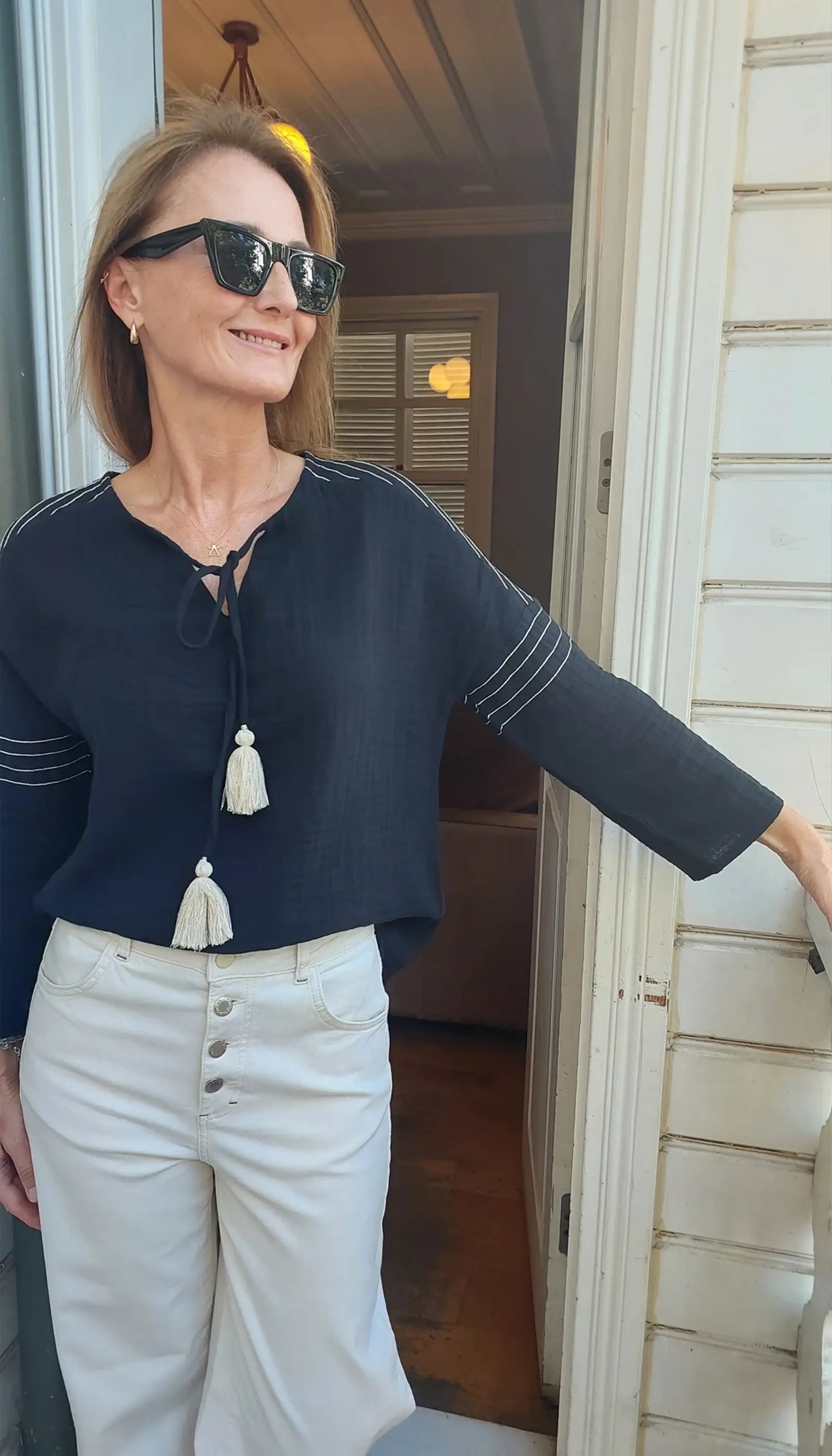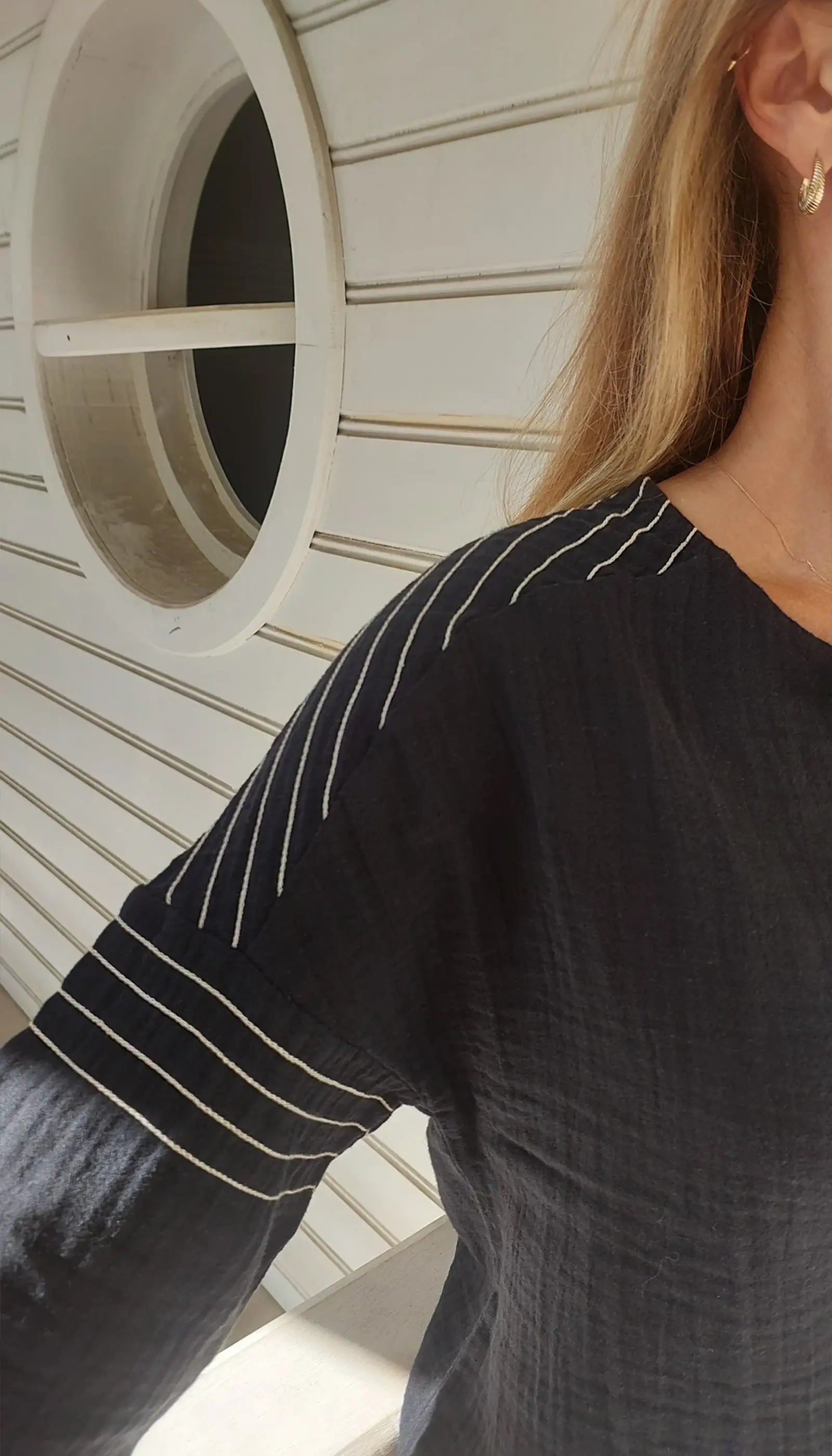 Omuzda Zincir Kroşeta detaylı Siyah Müslin Bluz