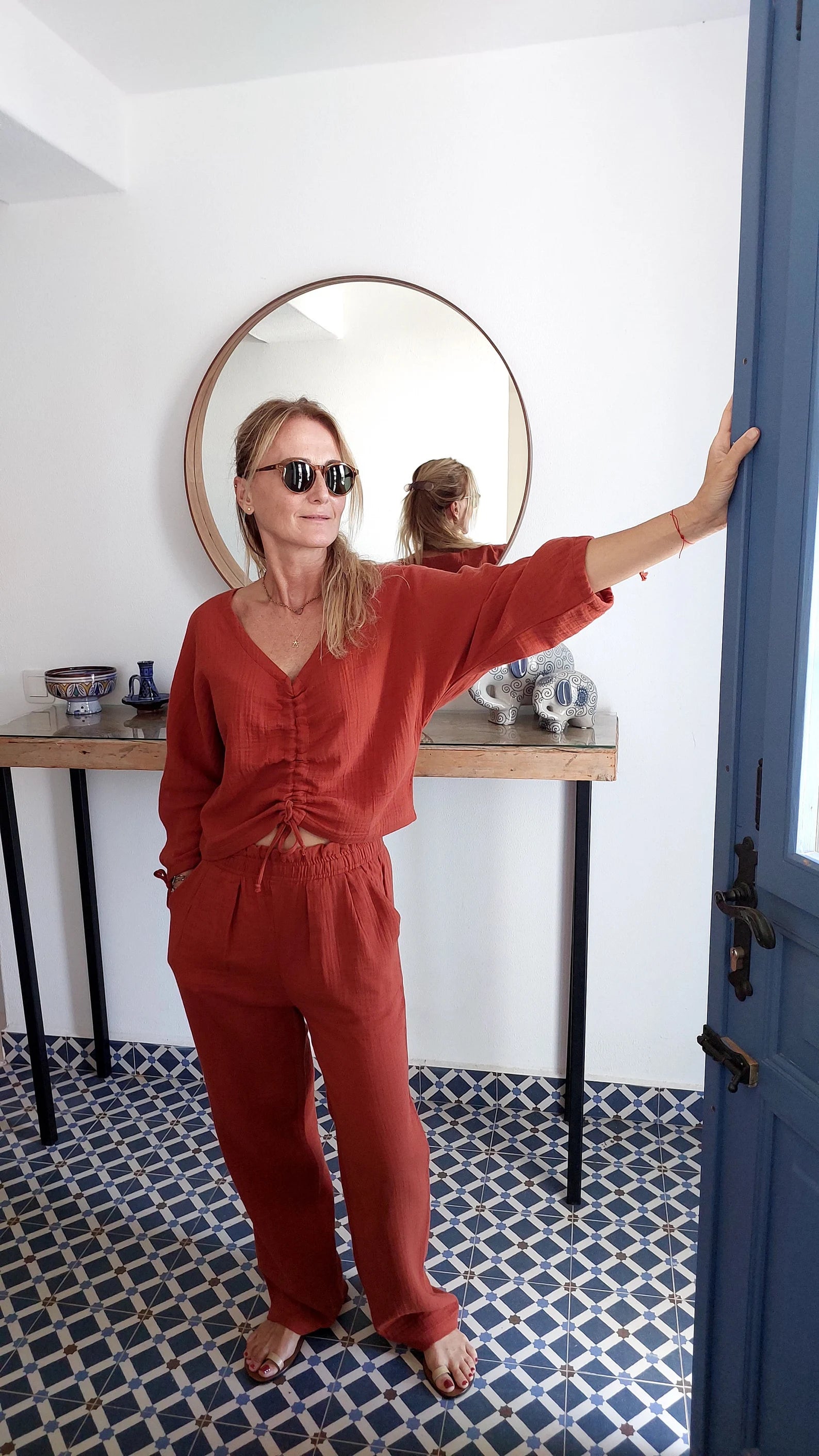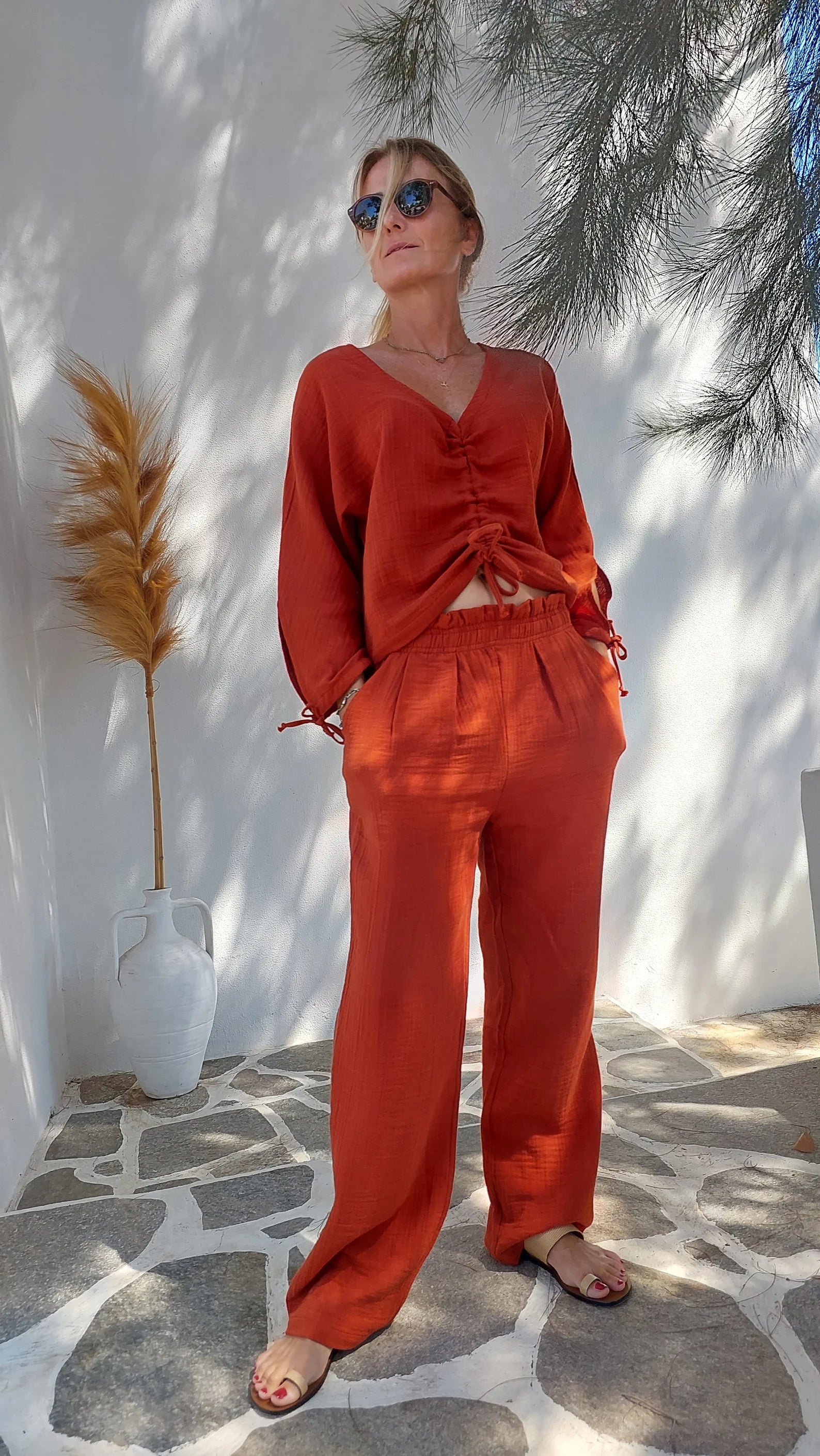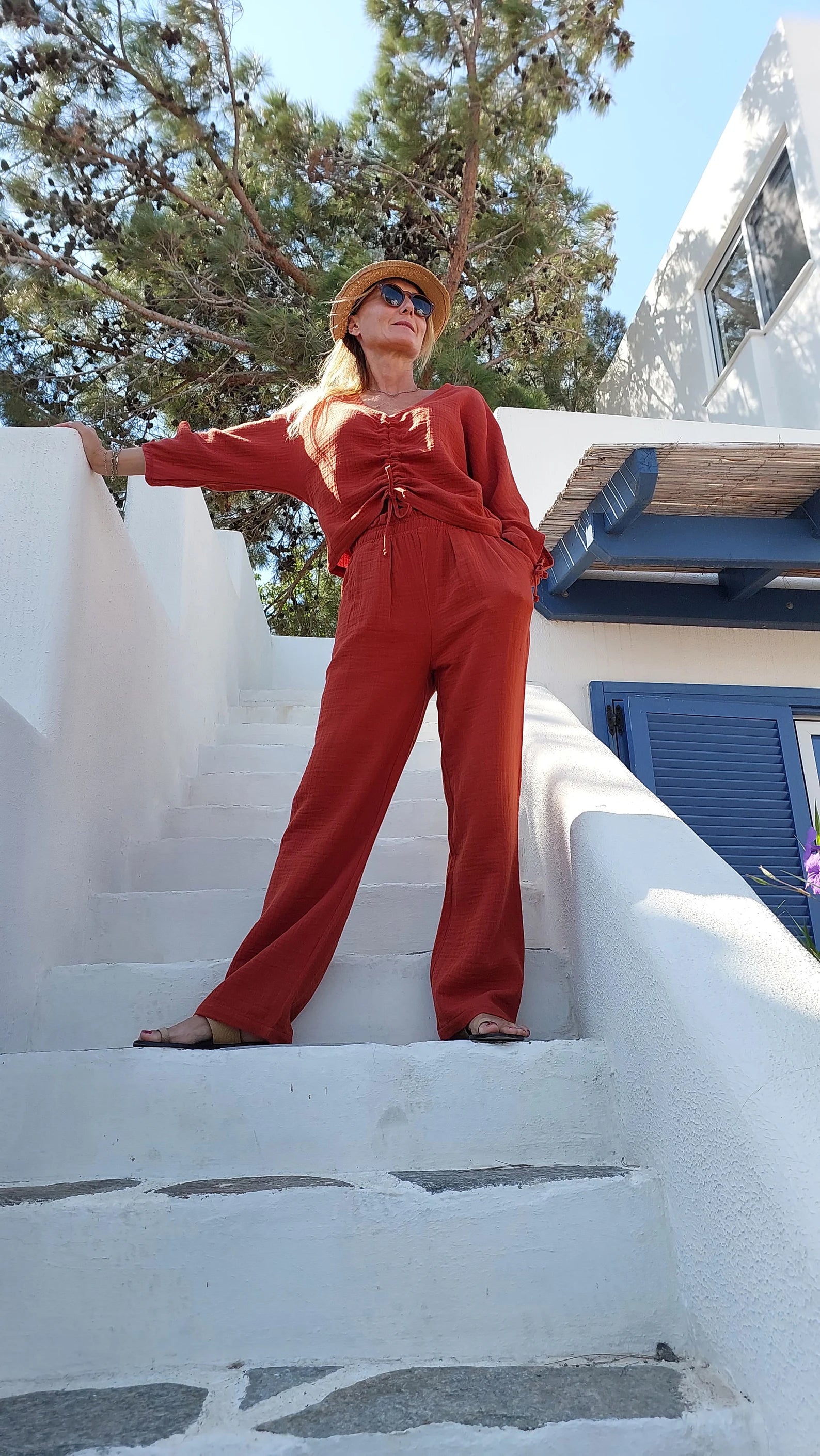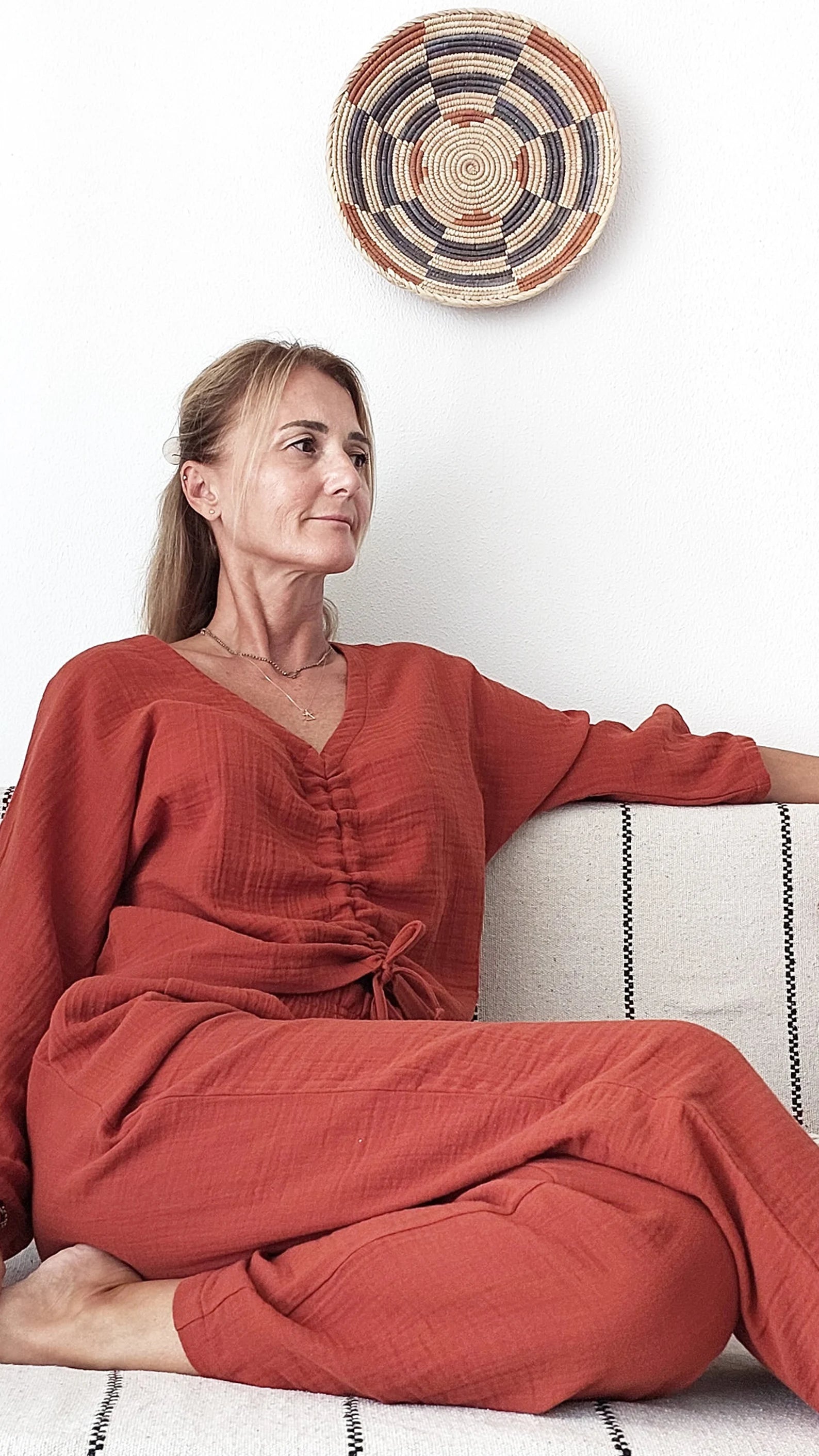 Zarafeti ve doğallığı bir araya getiren bu özel tasarım bluz, %100 organik sertifikalı pamuk müslinden üretilmiştir. Hafif ve nefes alabilen dokusu sayesinde her mevsim rahatlıkla kullanabileceğiniz zamansız bir parçadır.
