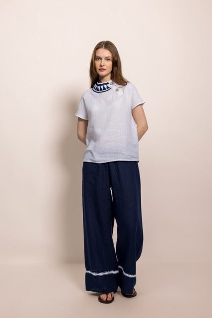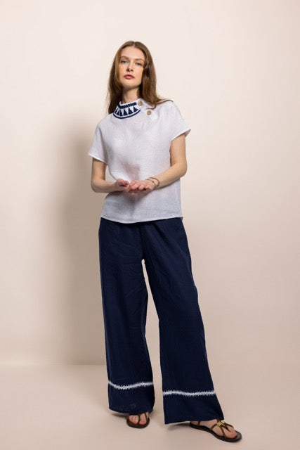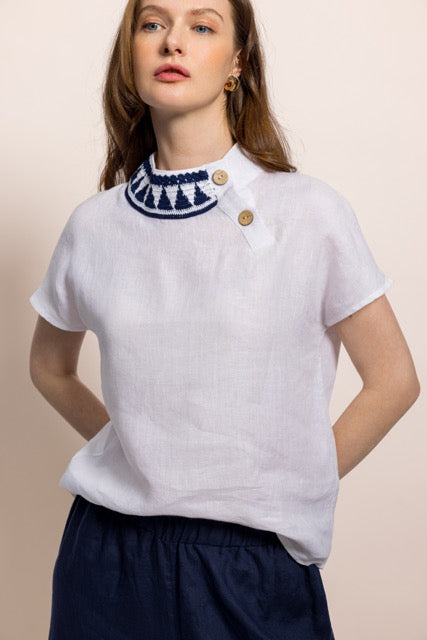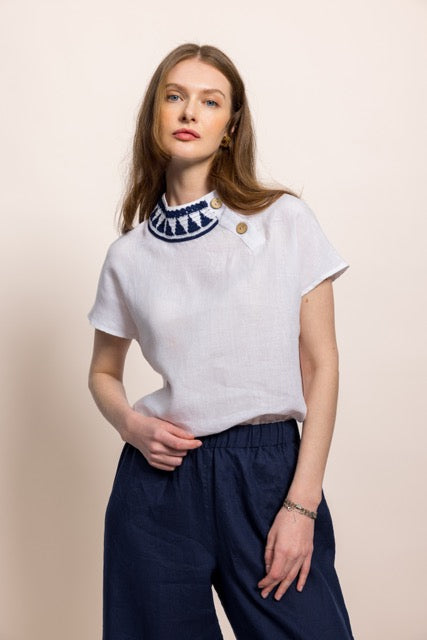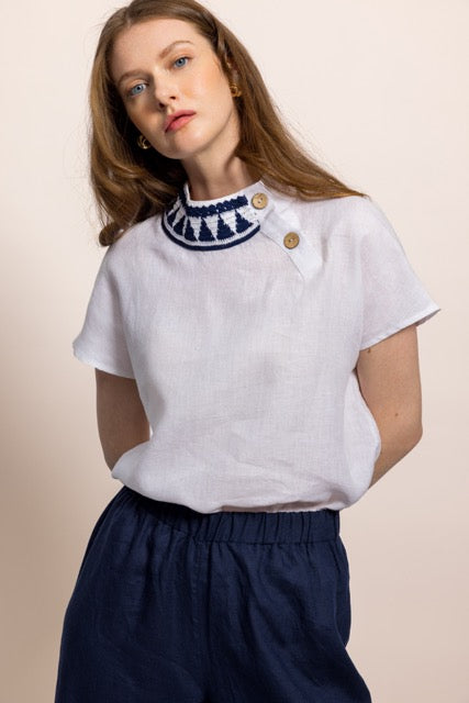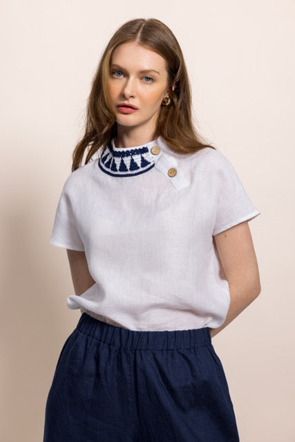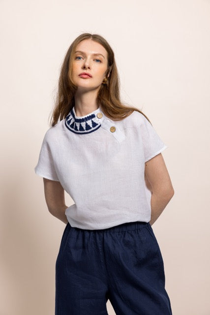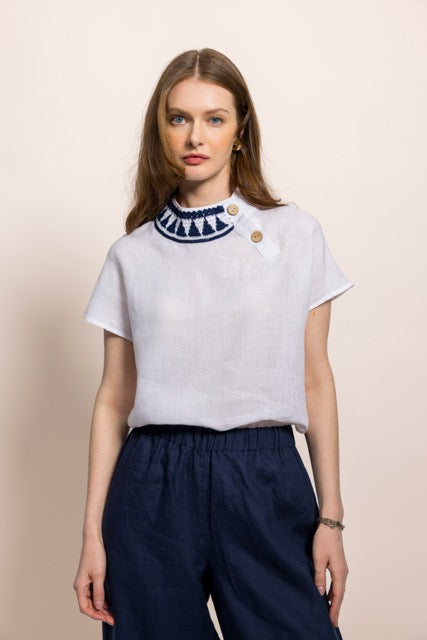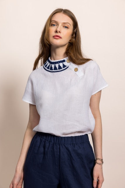 İbibik Beyaz ve Lacivert Yakası İşlemeli Beyaz Keten Bluz