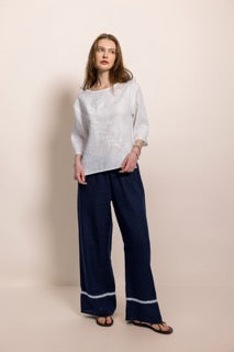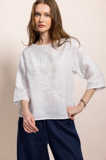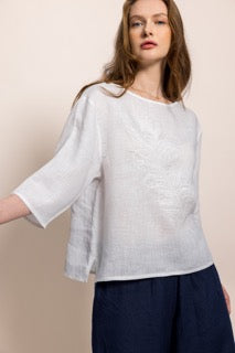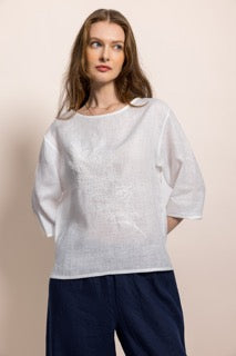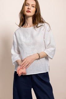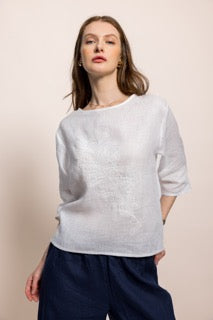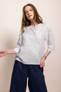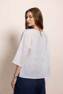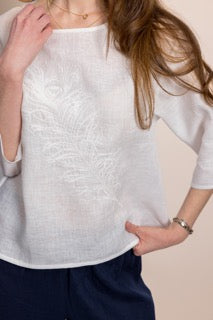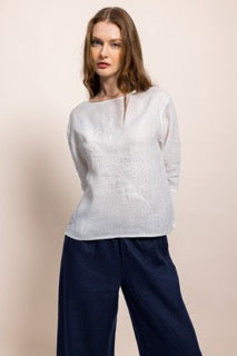 Zarafeti ve doğallığı bir araya getiren bu özel tasarım bluz, %100 organik sertifikalı keten kumaştan üretilmiştir. Hafif ve nefes alabilen dokusu sayesinde her mevsim rahatlıkla kullanabileceğiniz zamansız bir parçadır.